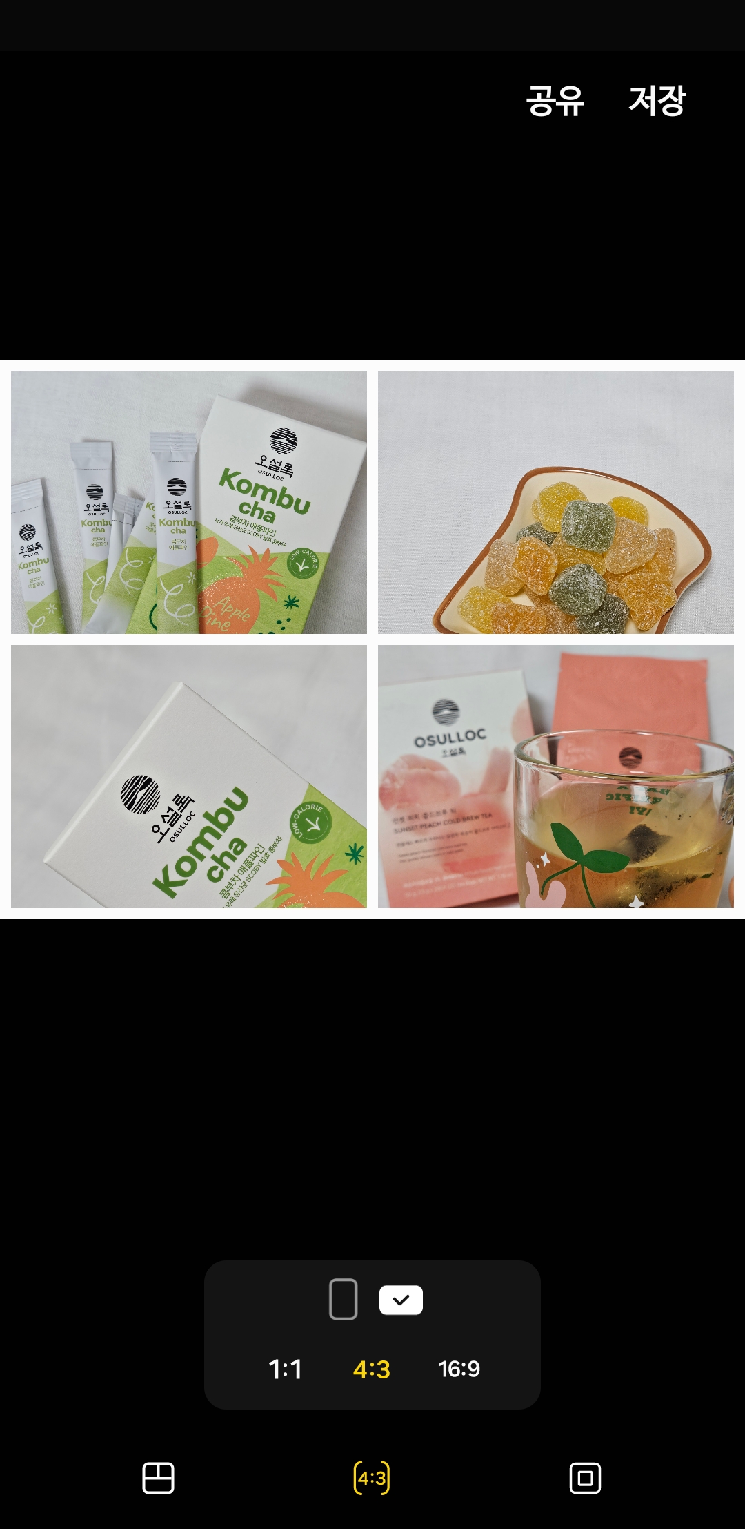아래쪽 가운데 버튼을 누르면 비율 조정이 가능합니다. 만들 이미지의 비율을 설정할 수 있습니다. 1:1, 4:3, 16:9 세 가지로 선택이 가능하고 가로형, 세로형을 정할 수 있습니다.