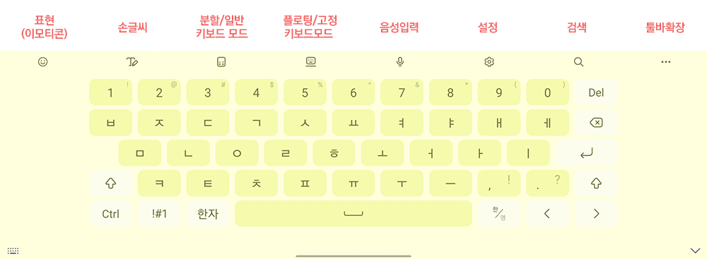 갤럭시탭을 가로모드로 사용하면서 키보드를 어떻게 사용해야 할까 고민이 많았습니다. 나중에 알았지만 키보드도 여러 모드로 지원이 되더군요. 아래 이미지의 세 번째 버튼을 통해 일반 키보드 혹은 분할 키보드로 변경할 수 있습니다.