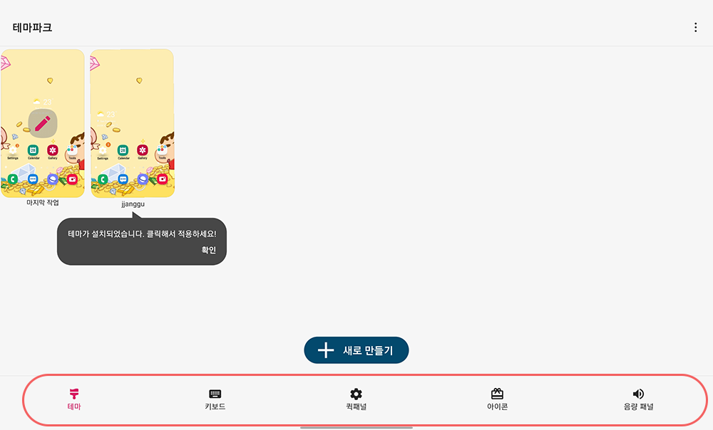 테마파크는 기기의 전반적인 테마를 생성하고 적용할 수 있는 어플입니다. 갤럭시 스토어에서 다운로드받을 수 있습니다. 설정된 배경화면에 맞춘 테마 컬러를 기본으로 제공합니다. 원하는 색상만 선택하면 간편하게 테마를 만들 수 있습니다. 전화, 문자, 설정, 타이머 등 기본 화면의 주요 색상도 원하는 대로 바꿀 수 있습니다. 상세하게 수정할 수 있는 것들은 퀵패널과 음량패널, 키보드, 아이콘의 스타일 등이 있습니다. 아이콘의 경우 아이콘 팩을 따로 다운받아 적용시킬 수 있습니다.