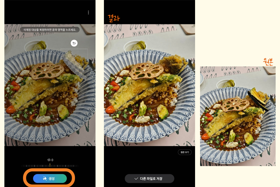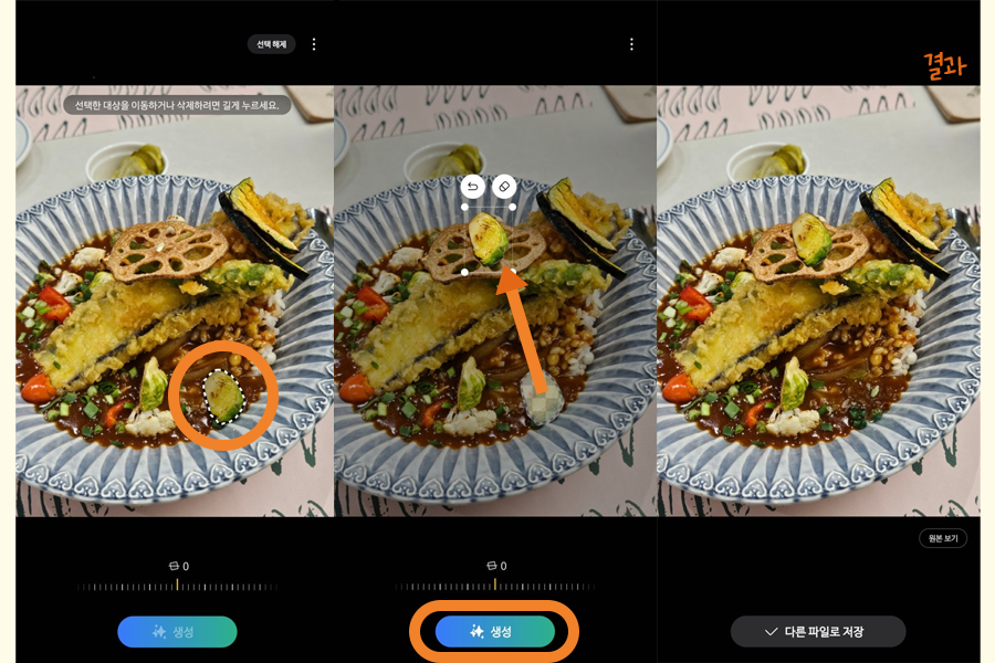 외부에서 촬영하다 보면 원하지 않는 사람들이 함께 찍히는 경우가 많죠? 이렇게 다른 사람이 찍혔을 때 타인을 지우기 편한 기능입니다. 결과물이 마음에 들면 바로 [다른 파일로 저장] 을 누르면 됩니다. 저장을 원하지 않는 경우 [뒤로가기 - 저장 안 함] 을 선택하면 됩니다.
