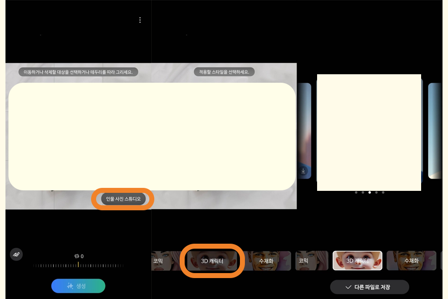 갤럭시 기기에서 제공하는 AI 기능입니다. 이미지의 특정 대상을 이동하거나 삭제해 이미지를 재구성하거나 삭제된 영역을 생성하는 등의 기능을 제공합니다. 인물의 경우 인물 사진 스튜디오에서 다른 그림체로 인물 사진을 생성할 수 있습니다.